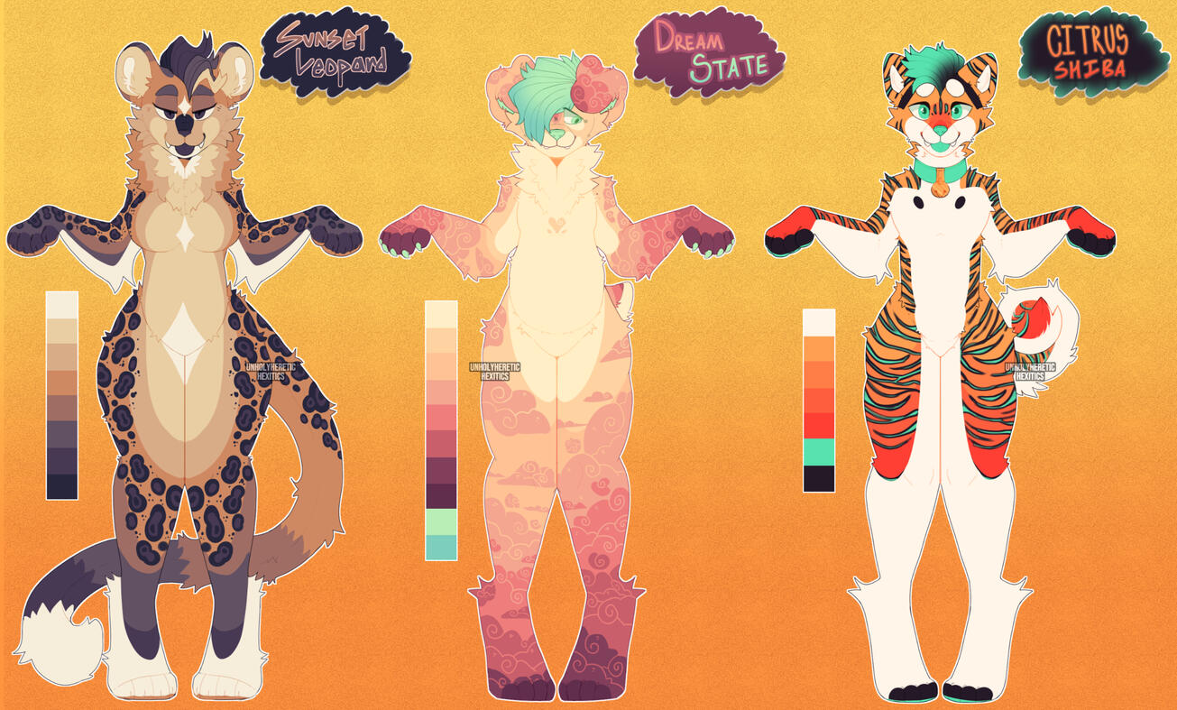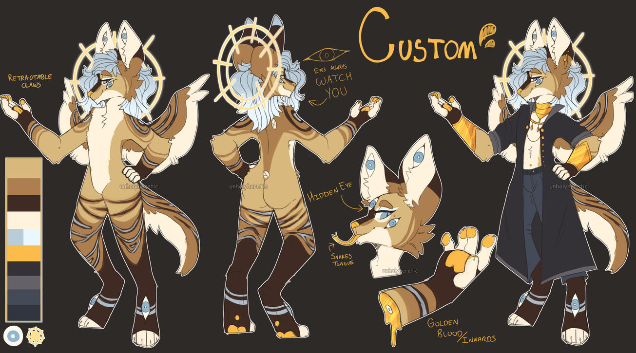 *Custom Character Sheets come with: A Front and back view, a headshot, and maw and or paw view. This also comes with accessory shots, and any small additions that aren't a fullbody/bust.